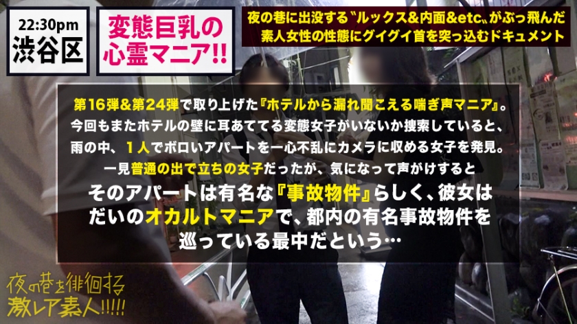 夜の街で出会った「普通じゃない」女性の素顔を暴くドキュメント。雨の渋谷で心霊スポットを撮影していたポニーテールの美女に同行し、都下へレンタカーを走らせます。目的地は、深い怨念が眠る八●子城と、女児の霊が彷徨う旧●峰トンネル。八●子城では深夜の静寂とぬかるみに足を取られ、トンネルでは街灯ひとつない暗闇と鏡の反射に背筋を凍らせました。恐怖に震えながら撮影を終えた後、車中でお姉さんは「普段のソロ活とは比較にならないほど怖い」と本音を漏らします。そこでホテルへ誘うと、恐怖がもたらす吊り橋効果によって彼女の警戒心は消失。密室へ入ると、恐怖体験の反動か彼女は一気に発情。露わになった白い肌と、貪るようなキスの応酬。清楚な淑女が、濡れたマ●コを突き出し声を上げる淫乱な女へと変貌する様は圧巻でした。恐怖を共有した末に待っていたのは、最高にエロティックな報酬でした。